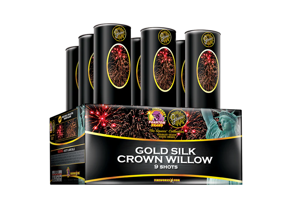 Powerful high-altitude finale rack! Awesome noise! Super long-lasting hanging willows in shimmering gold and red.